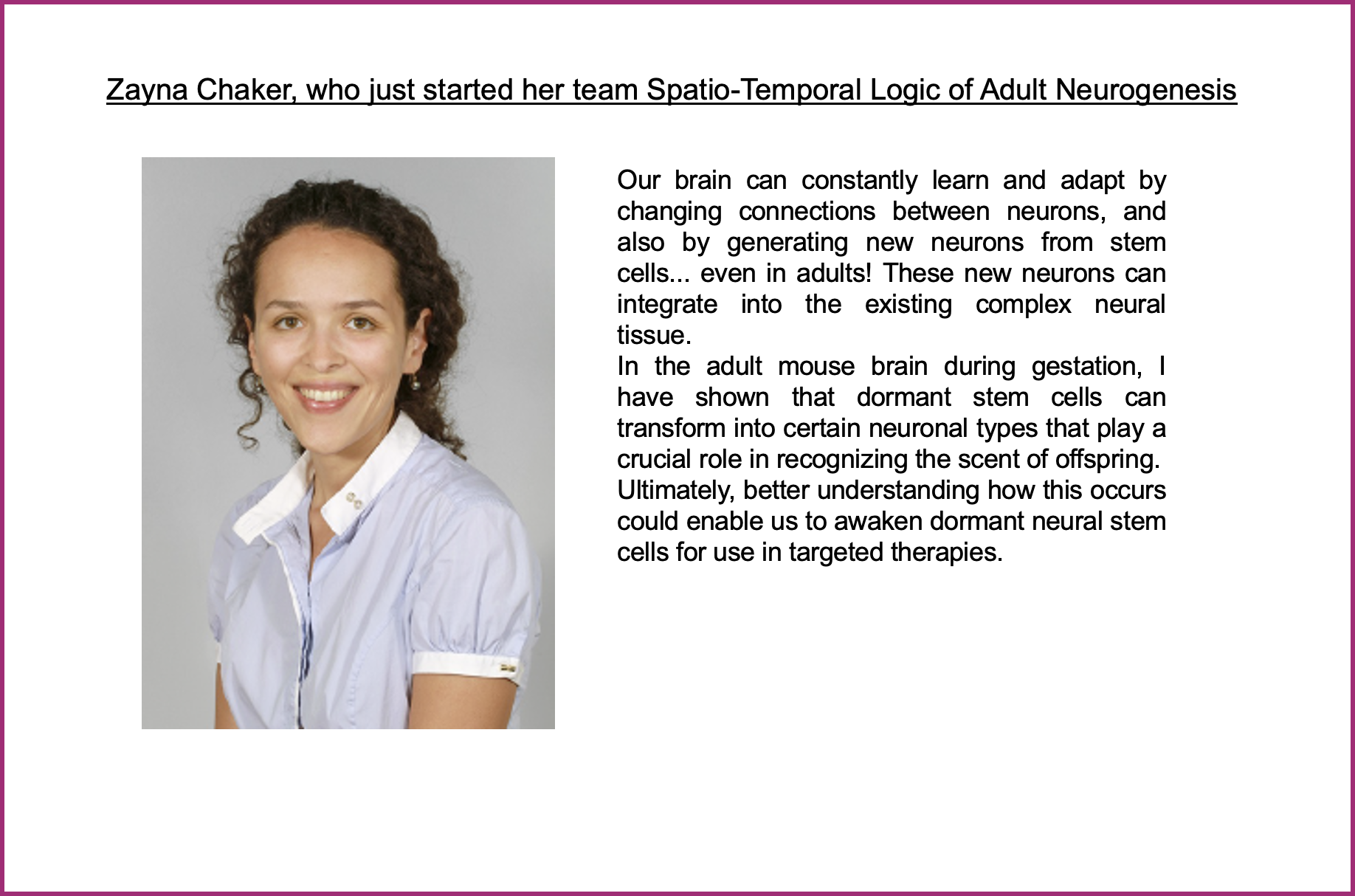 Spatio-Temporal Logic of Adult Neurogenesis - Z. CHAKER